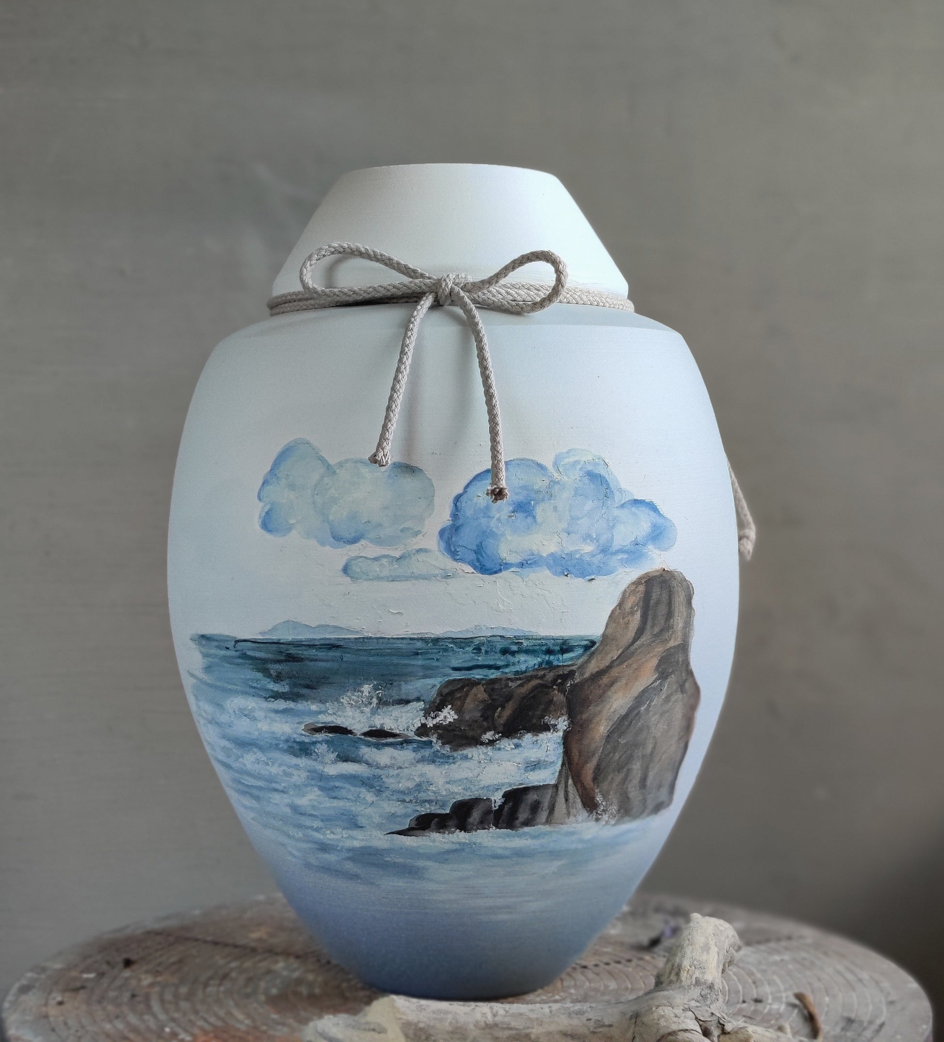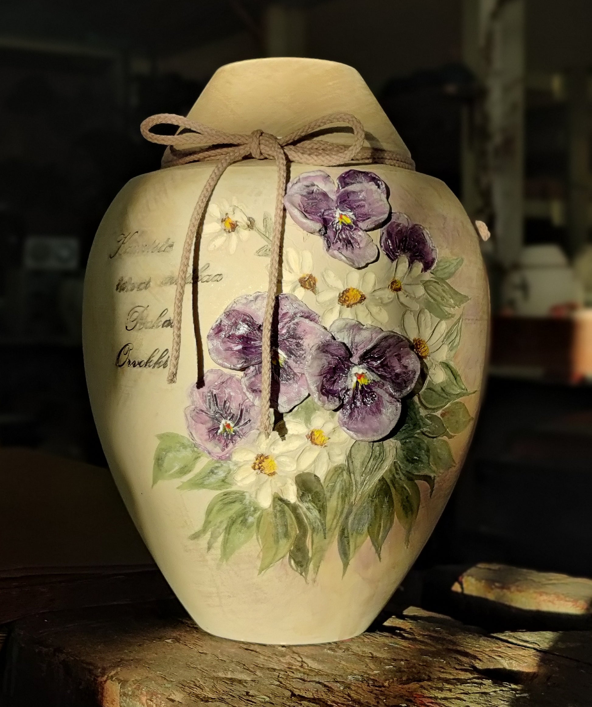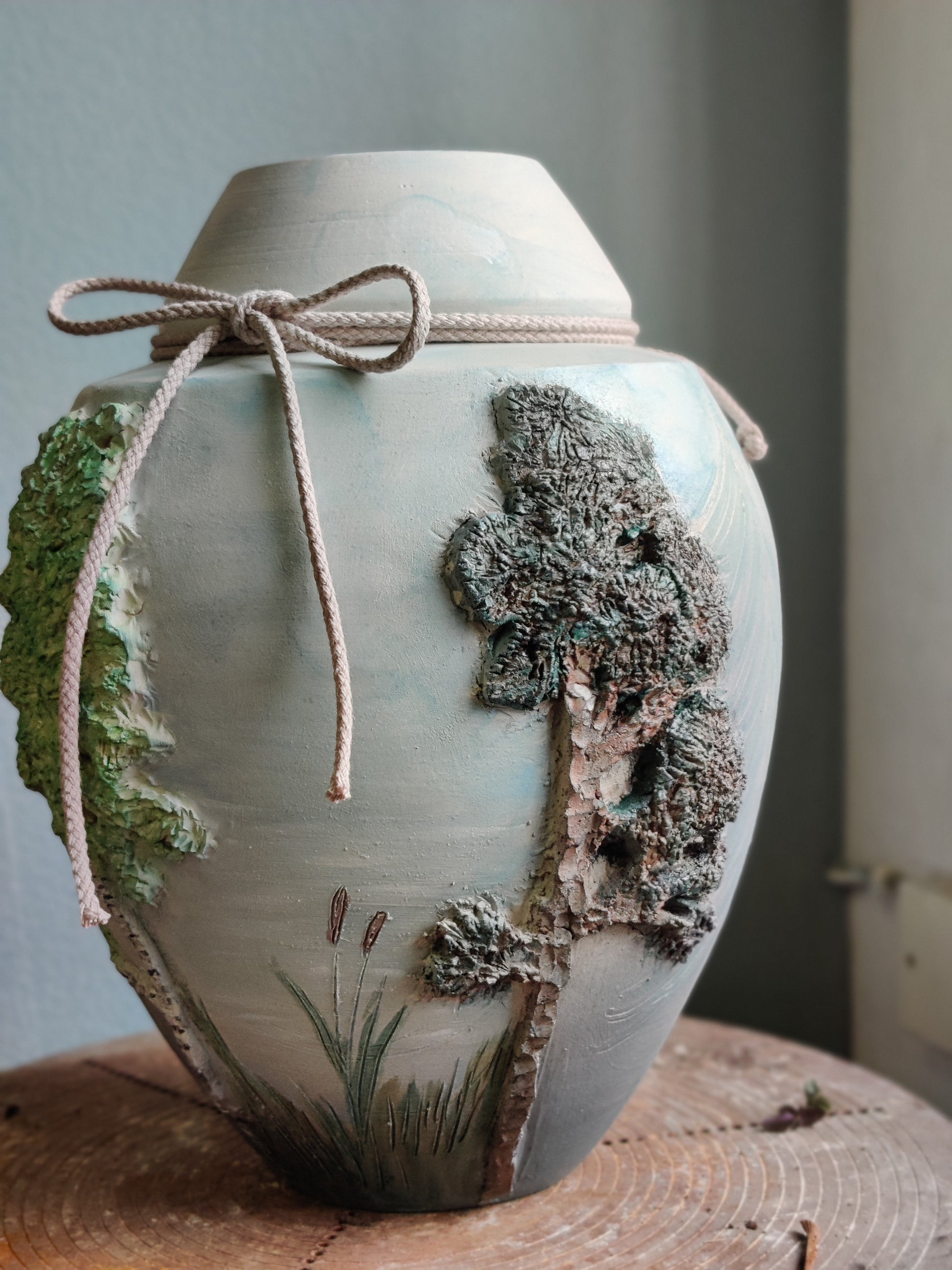 Täysin biohajoava käsintehty saviuurna. Lähetä kuva ja teksti, niin muovaamme uurnan toiveidesi mukaan.